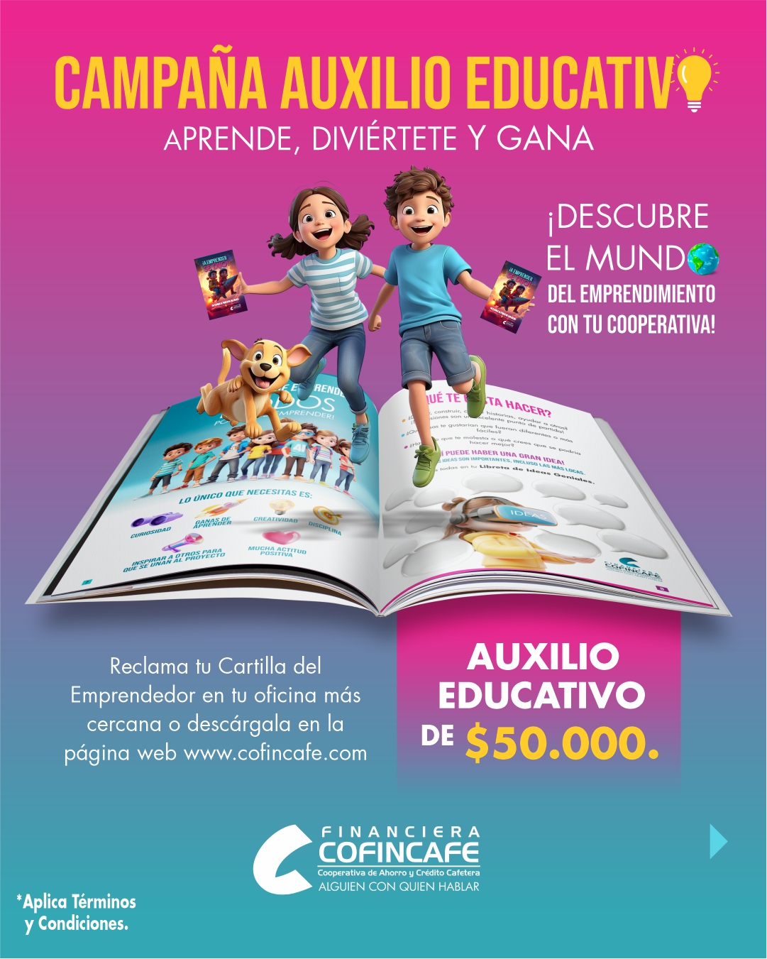 En COFINCAFE creemos que invertir en conocimiento es invertir en tu futuro. Por eso creamos el Auxilio Educativo, un apoyo de $50.000 para que sigas creciendo y alcanzando tus sueños.